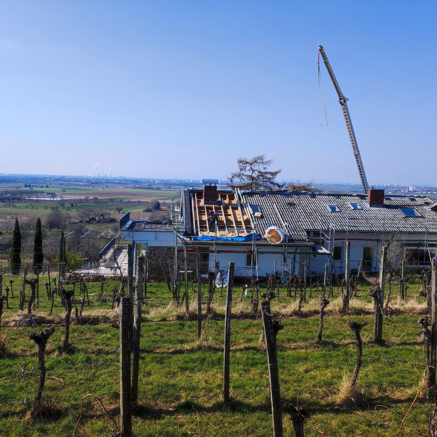 Damit es innen nicht mehr tropft, bekommen wir nun endlich ein neues Dach. Natürlich möchten wir auch die Sonne nutzen und so wird eine PV-Anlage istalliert, damit wir nicht nur Sonne im Glas, sondern auch im Batteriespeicher haben. Apropos Sonne im Glas, ein paar der 2021er Weine sind nun in der Flasche und bald verfügbar!