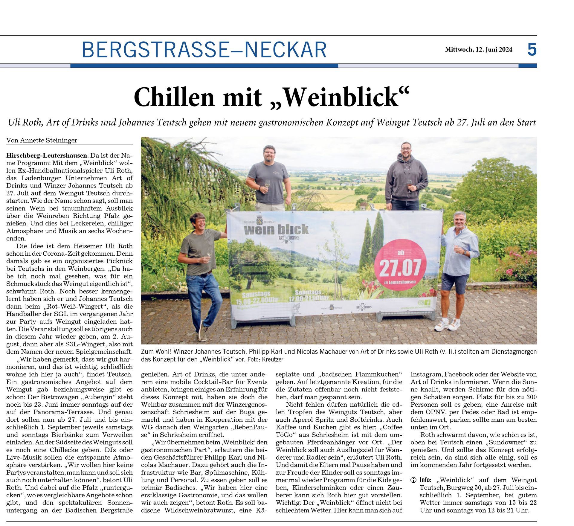 Mit der Planung steigt die Vorfreude auf unser 1. Sommerfest im Weingut! Gemeinsam mit Aubergin Gastronomie stellen wir ein vielfältiges Programm für Sie zusammen: unsere Weine und Weincocktails, leckeres Essen aus dem Bistrowagen, eine Band und natürlich auch was für die Kinder – Details folgen bald!