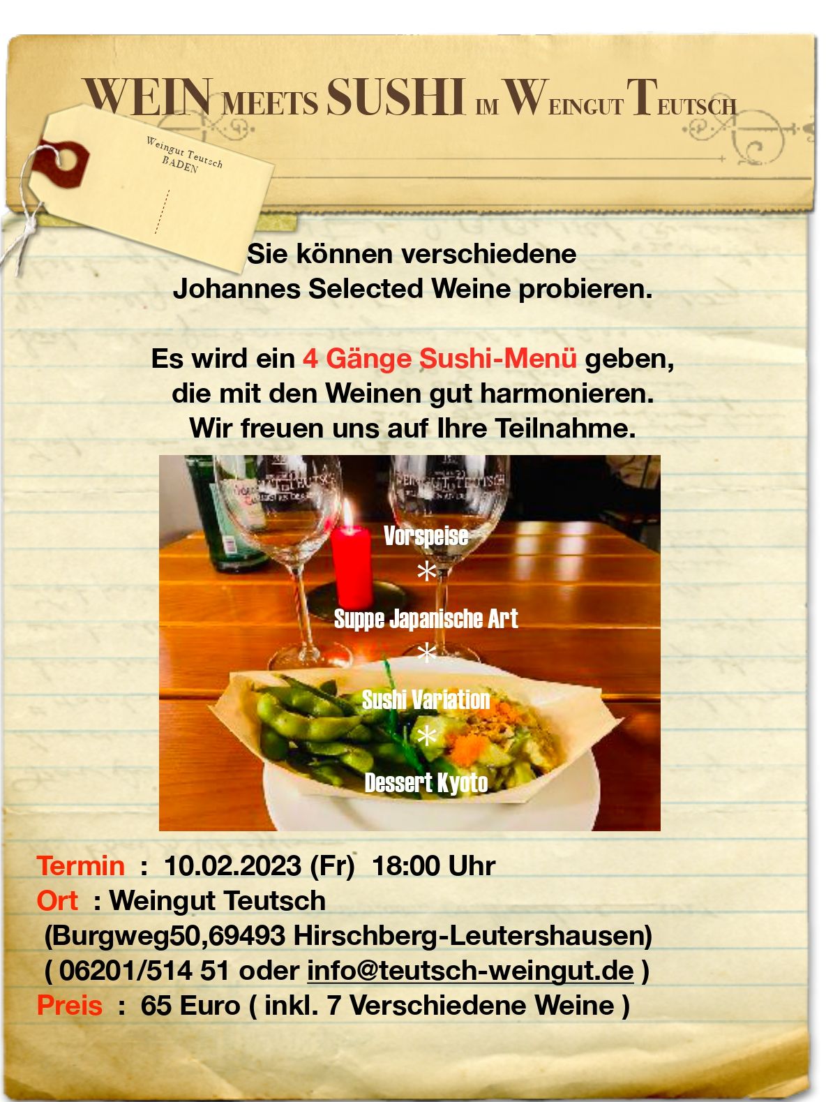 Am 19.11.2021 bereitet unser Freund Hideomi Kitagawa ein japanisches Menü für "Wine meets Sushi" zu. Dazu gibt es unsere Weine. Weitere Infos im Flyer. Wir bitten um Anmeldung und freuen uns auf Ihr Kommen!